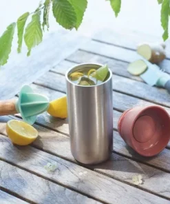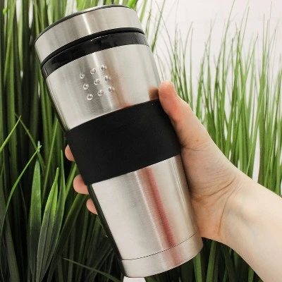 Stainless steel travel mug with black durable plastic for an easy stay cool grip. Double walled to keep drinks hot or cold, and an anti-skid layer for extra protection and to prevent heat damage to surfaces. Designed to fit almost all vehicle cup holders.