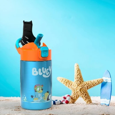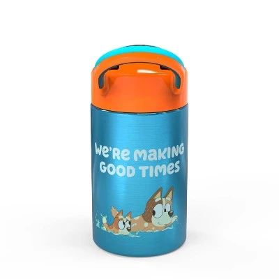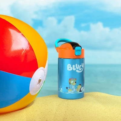 Help kids stay hydrated at the touch of a button with this Bluey stainless steel water bottle! The comfortable silicone spout has a cover to keep it clean and is made with antimicrobial materials, to help prevent the spread of germs. It opens at the push of a button, but includes a built-in locking mechanism to help stop accidental spills: simply slide the locking mechanism down to block the action lid, or up to unlock before pressing the button. The 14-ounce bottle is vacuum insulated, which keeps drinks cold for up to 10 hours and prevents condensation. All the materials are durable and BPA free, and a built-in carrying handle makes travel easy, letting kids hydrate on the go.