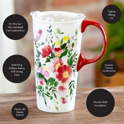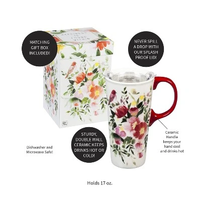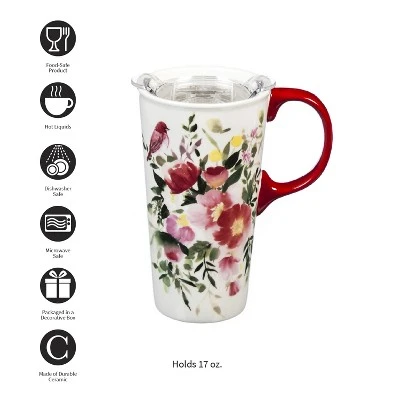 This 17 oz. white ceramic travel cup comes with a slide closure Tritan lid and a matching gift box. It has a red handle. It features red, pink, yellow florals and a cardinal bird. Microwave & dishwasher safe, remove top. At Evergreen, we are committed to producing premium, quality products to bring a touch of color and personality to your home. We respect and celebrate the uniqueness in everyone by offering one of the world’s largest selections of home and garden decor.