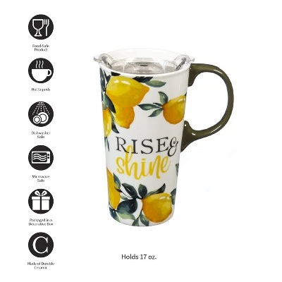 This 17 oz. white ceramic travel cup comes with a slide closure Tritan lid and a matching gift box. It has a black handle. It features lemons and reads: “Rise & Shine”. Microwave & dishwasher safe, remove top. At Evergreen, we are committed to producing premium, quality products to bring a touch of color and personality to your home. We respect and celebrate the uniqueness in everyone by offering one of the world’s largest selections of home and garden decor.