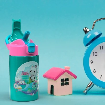 Help kids stay hydrated at the touch of a button with this Gabby’s Dollhouse stainless steel water bottle! The comfortable silicone spout has a cover to keep it clean and is made with antimicrobial materials, to help prevent the spread of germs. It opens at the push of a button, but includes a built-in locking mechanism to help stop accidental spills: simply slide the locking mechanism down to block the action lid, or up to unlock before pressing the button. The 14-ounce bottle is vacuum insulated, which keeps drinks cold for up to 10 hours and prevents condensation. All the materials are durable and BPA free, and a built-in carrying handle makes travel easy, letting kids hydrate on the go.