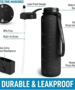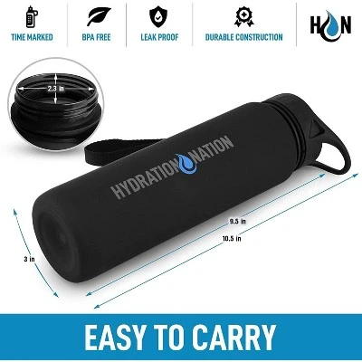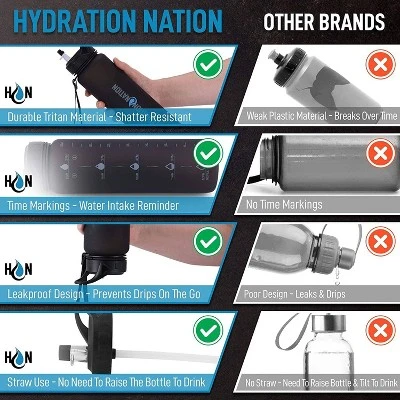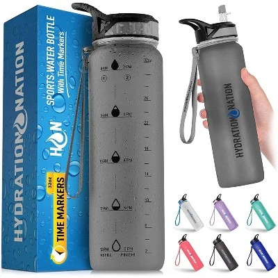 Staying hydrated is often easier said than done especially when days get hectic with an always-on-the-go daily schedule. With the Hydration Nation Water Bottle with Time Markers, you can now keep track of your daily water intake at the right time no matter how busy you are. Crafted with large and clear printed time & ounces markings, you can now stay hydrated and refreshed from day to night. Made from heavy-duty Tritan material that is impact-resistant making this water bottle strong and durable, unlike other cheaply-made alternatives that fall apart easily. Designed with a foldable mouthpiece and attachable straw for hassle-free leak-proof storage during any indoor or outdoor activity. Its 32oz capacity is enough to keep you fresh and hydrated throughout the day anywhere, anytime. Features a leak-proof lid designed with a foldable mouthpiece and soft silicone detachable tip. Conveniently designed for comfort when on the go, the lid comes with an attachable straw allowing you to simply drink without needing to raise or tilt the bottle. You can now experience a super-easy way to stay hydrated during mid-workout while keeping track of your water intake every hour. Engineered for daily use, this water bottle is both sturdy and durable for any activity. Thoughtfully designed with a removable carrying strap, you can easily carry this around whether you’re working out or traveling. Features wide mouth and twistable lid for easy liquid refills. Comes in stylish modern hues and colors to choose from! Hand wash is recommended when cleaning. We have the utmost confidence in our Water Bottle with Time Marker and we back this up with a 5-year warranty. We ensure that this product will last but if there are ever any issues, just contact us and we will make it right. Order today and we will make your day! If it does not, we got you covered. Chances are, you will never need to reach out! Track Your Water Intake Throughout The Day Track your water intake at the right time throughout your day Perfect for a person with a tight and always on-the-go daily schedule time & ounces marking Accurate measurements Your Ultimate Hydration Partner Made from heavy-duty Tritan Strong & durable 32 oz water bottle capacity BPA Free Innovative & Convenient Leakproof lid design Spring-loaded dust cap Single-handed locking lid Comes with a soft silicone straw & foldable silicone mouthpiece Modern & Stylish Design Sturdy & convenient bottle water Plenty of distinctive hues and colors to choose from Designed with a removable carrying strap Hand wash is recommended Motivational water bottle, motivational water bottle with straw, gym bottles, or fitness workout water bottle Timed marked, intake tracker Does not include gallon water bottle motivational, 1-gallon water jug, 2-liter water bottle