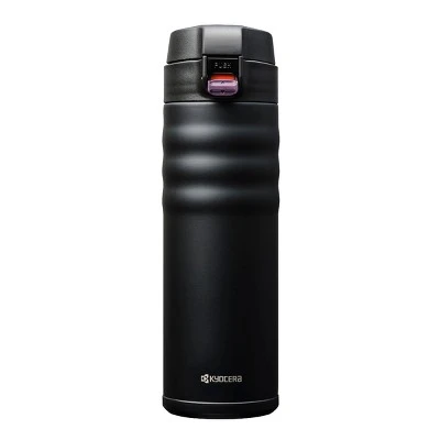 Keep your coffee hot with this travel mug from Kyocera. This stainless steel mug’s interior is lined with ceramic, preventing staining or rust as well as a metallic taste from ruining your drink. The double wall vacuum seal helps keep hot or cold drinks at temperature for 6 to 12 hours. The safety lock lid is designed to open with one had, but more importantly makes this mug spill proof. The wide mouth makes refilling easy and this mug is dishwasher safe for easy clean up. Measurements: 17 ounce capacity