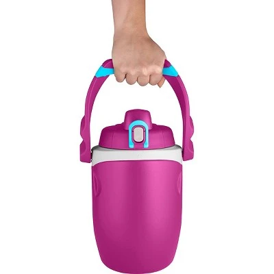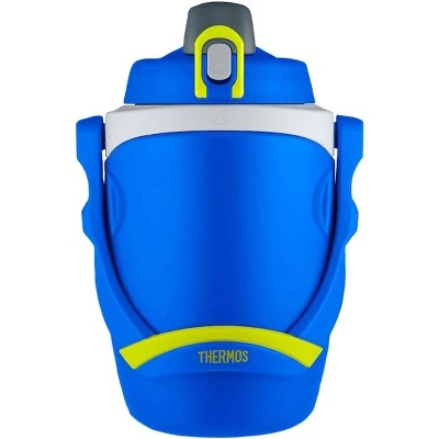 The Thermos 64 oz. Foam Insulated Flip-Up Lid Hydration Water Bottle is the ultimate hydration bottle with an impressive capacity to hold your favorite cold drink. Sip it, chug it, and swig it all day long without needing to refill all the time. The double wall foam insulation keeps your drinks cold for up to 12 hours. You can operate the push button lid with just one hand, making it easier than ever for you to quench your thirst quickly. The lid locks for secure transport and the carrying handle allows for easy transportation. Made with BPA-free materials and features an ergonomically-designed body for a comfortable grip. Please Note: Not for use with hot liquids.